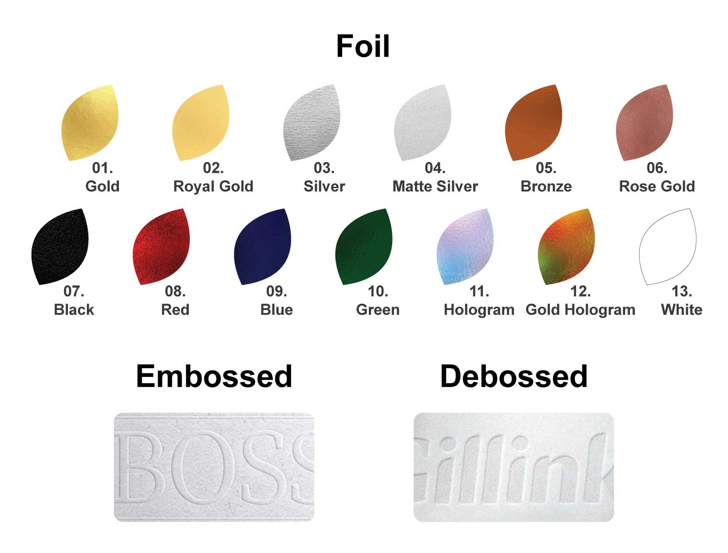 - Paper Stocks: Our premium paper options include textured, matte, and glossy finishes to complement both the foil and embossed areas. Select the paper that best fits your style and event’s aesthetic.